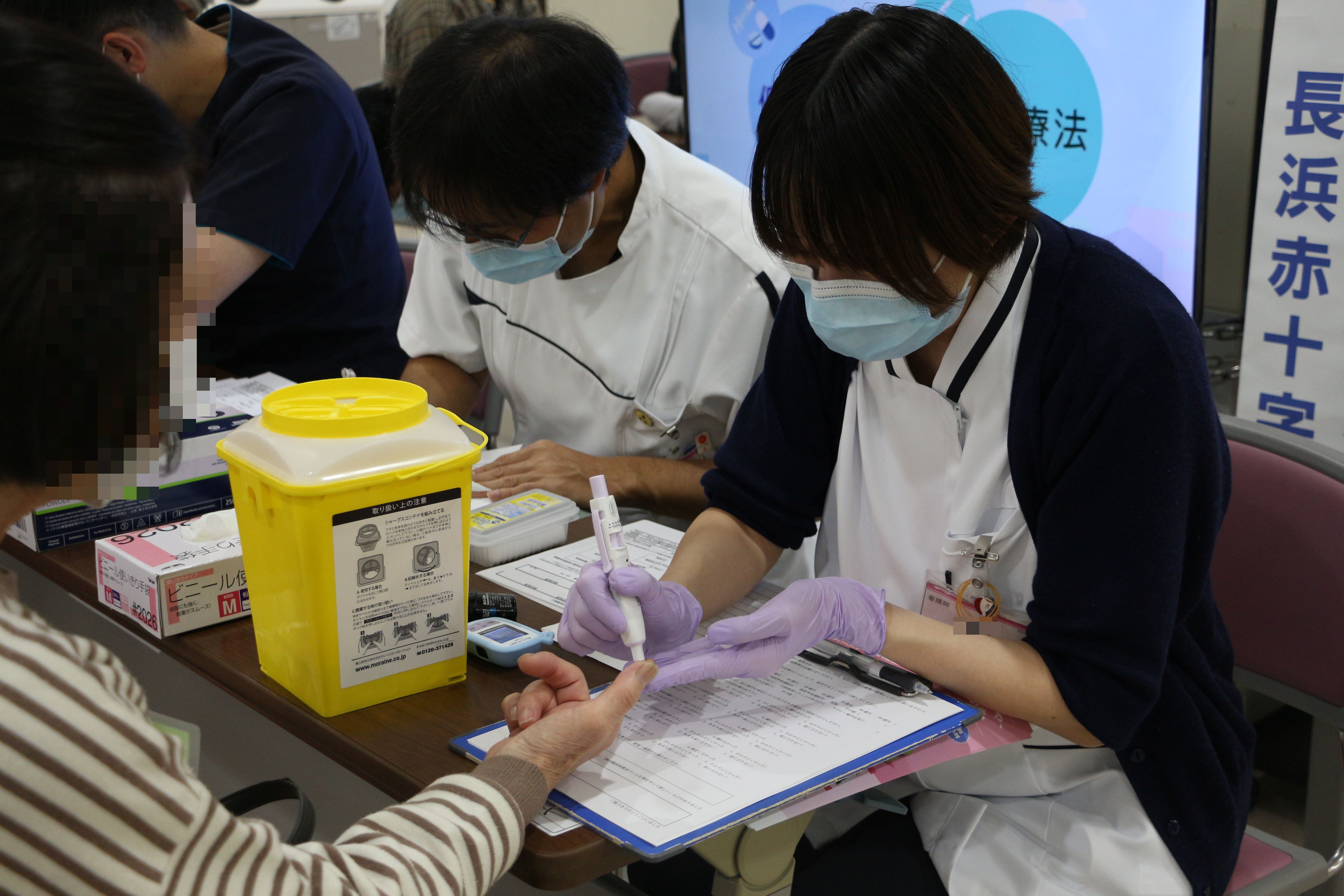 当院では世界糖尿病デーにちなんで毎年11月に特別糖尿病教室を開催しています。体験ブースで血糖値・血圧・体脂肪率・筋力測定等を行い、管理栄養士・薬剤師による相談ブースも設けたところ、今年は100名以上の方に参加していただきました。ありがとうございます。この催しがご自身やご家族の健康について考えるきっかけになればうれしく思います。今後も地域の皆さんの健康づくりに貢献できるよう、糖尿病チームで力を合わせて活動してまいります。